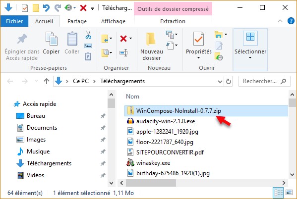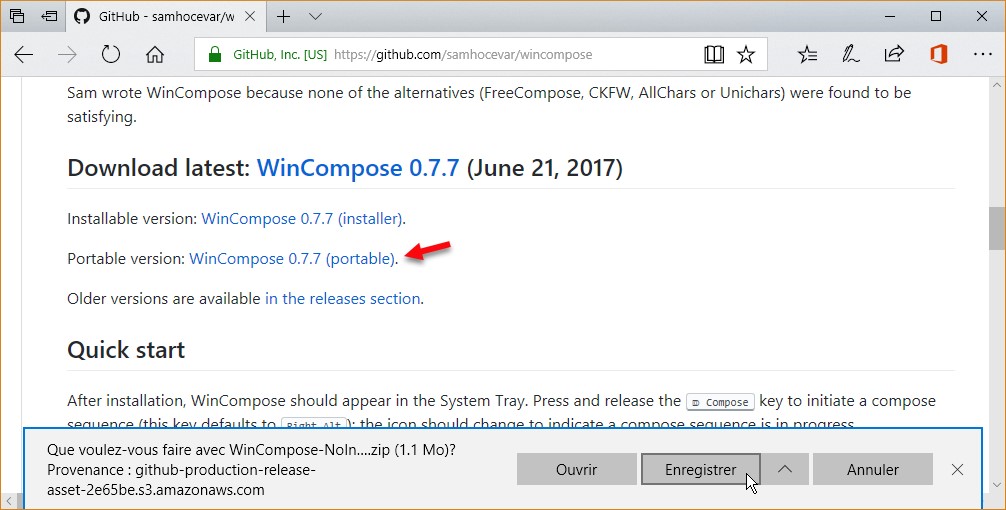 Rendez-vous sur la page https://github.com/samhocevar/wincompose, cliquez sur le lien WinCompose en version portable. Lorsque vous lirez ces lignes, il se peut qu’une version plus récente soit disponible. Peu importe : téléchargez la dernière version en date, pourvu qu’elle soit « portable ». Vous pourrez ainsi l’utiliser sans l’installer. Une mini boîte de dialogue s’affiche dans la partie inférieure du navigateur. Cliquez sur Enregistrer :