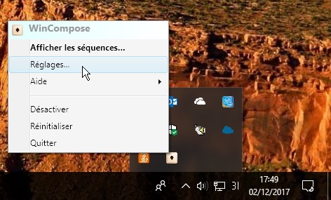 Pour insérer un caractère, vous devez reproduire la séquence de touches qui s’affiche à sa droite. La première touche de chaque séquence correspond à une touche spéciale qui déclenche la mise en route de WinCompose. Plusieurs touches sont utilisables. Pour choisir celle qui vous convient le mieux, cliquez du bouton droit sur l’icône de WinCompose dans la zone de notification, puis choisissez Réglages dans le menu :