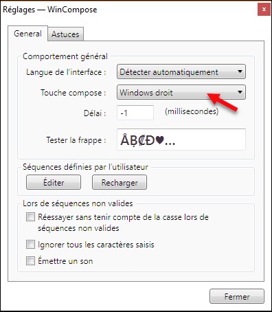 La boîte de dialogue Réglages s’affiche. Sous l’onglet Général, utilisez la liste déroulante Touche compose pour choisir la touche spéciale à utiliser. Ici par exemple, la touche Windows de droite a été choisie :