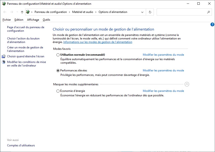 Cliquez sur Démarrer, tapez alimentation et cliquez sur Choisir un mode de gestion d’alimentation dans la partie supérieure du menu Démarrer. La section Options d’alimentation du panneau de configuration s’affiche :