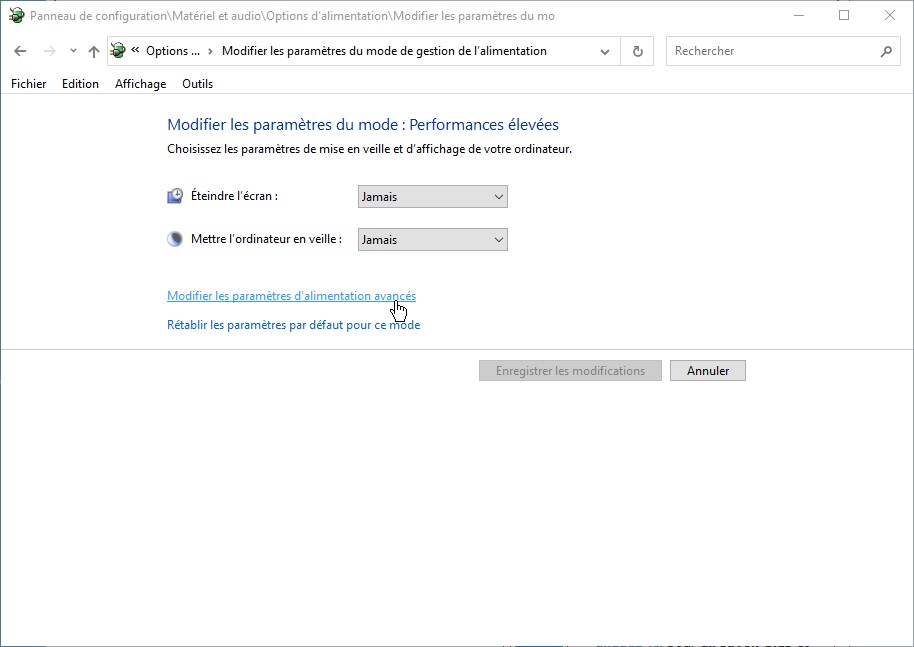 Cliquez sur Modifier les paramètres du mode en face de l’option sélectionnée (ici, en face de l’option Performances élevées). Une nouvelle boîte de dialogue s’affiche. Cliquez sur Modifier les paramètres d’alimentation avancés :