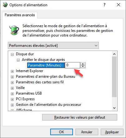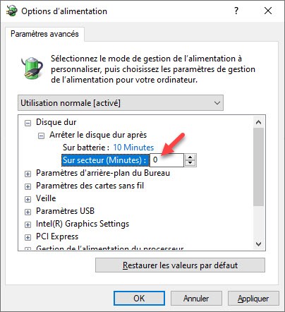 La boîte de dialogue Options d’alimentation s’affiche. Sur un ordinateur de bureau, tapez 0 dans la zone de texte Paramètres (Minutes), sous Arrêter le disque dur après et validez en cliquant sur OK :