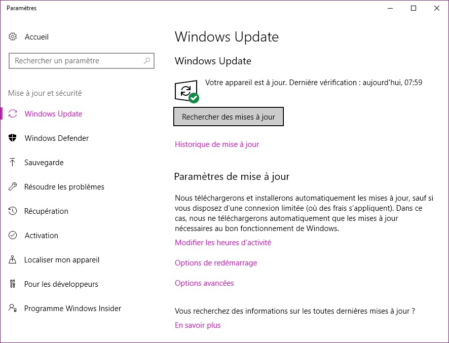 Cliquez sur Démarrer ou appuyez sur la touche Windows du clavier, tapez mise à jour et cliquez sur Paramètres de Windows Update dans la partie supérieure du menu Démarrer. La fenêtre Paramètres s’affiche, onglet Windows Update sélectionné :