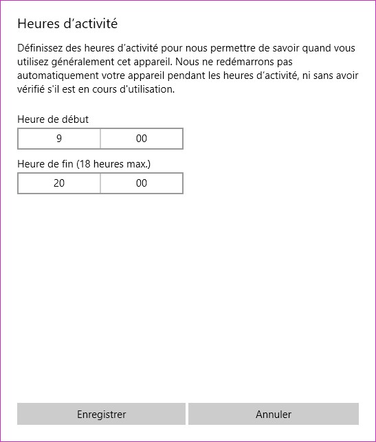Pour éviter le redémarrage de l’ordinateur à certaines heures, cliquez sur Modifier les heures d’activité et définissez les heures pendant lesquelles vous ne voulez pas que Windows redémarre suite à une mise à jour. Ici entre 9 heures et 20 heures :