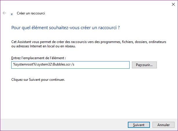Où nom est le nom de l’économiseur d’écran à utiliser. Par exemple, pour utiliser l’économiseur d’écran Bubbles.scr, tapez :