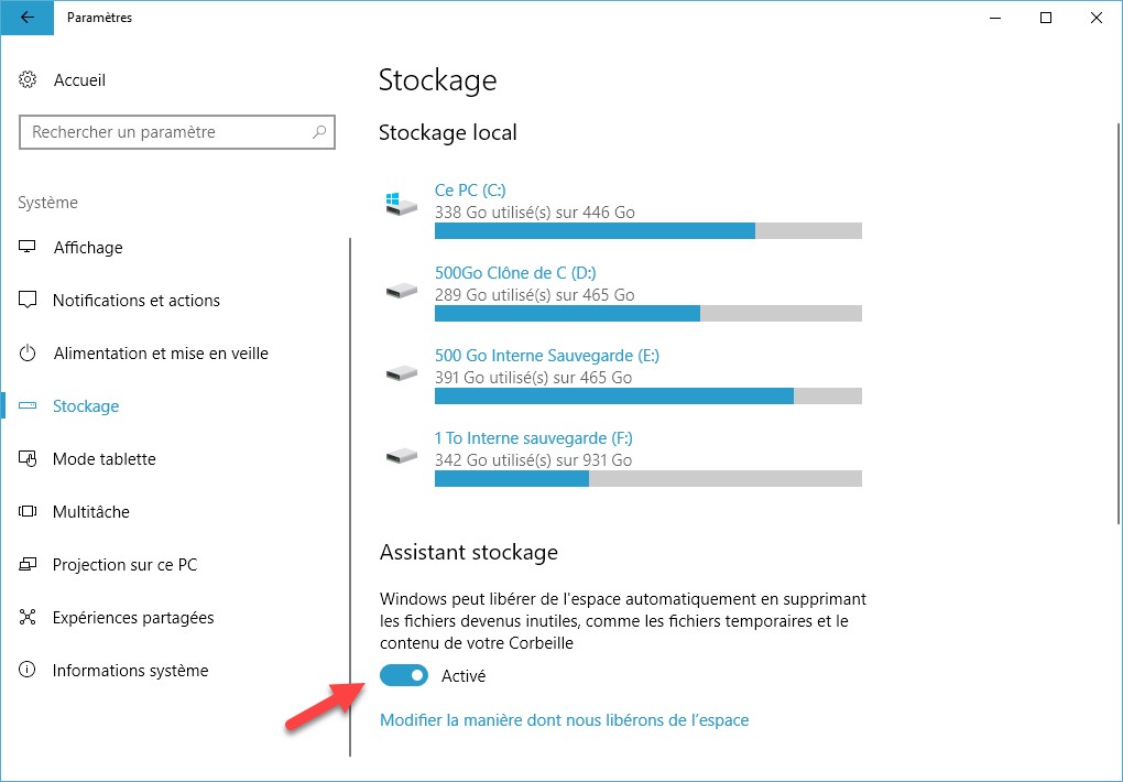 Pour activer cet assistant, cliquez sur Démarrer ou appuyez sur la touche Windows du clavier, puis cliquez sur l’icône Paramètres. La boîte de dialogue Paramètres Windows s’affiche. Cliquez sur l’icône Système et sélectionnez l’onglet Stockage. Activez l’assistant stockage en déplaçant l’interrupteur Assistant stockage sur Activé :