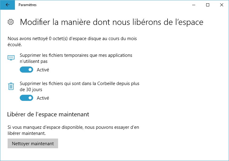 L’assistant stockage se charge de libérer automatiquement de l’espace sur le disque principal de l’ordinateur. Pour cela, il supprime automatiquement les fichiers temporaires et vide la Corbeille tous les 30 jours.
