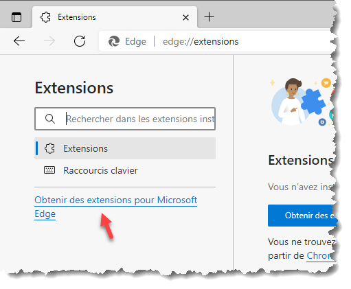 Cliquez sur l’icône Paramètres et plus dans l’angle supérieur droit de la fenêtre de Microsoft Edge et cliquez sur Extensions dans le menu. La page edge://extensions/ s’affiche. Sous Extensions, cliquez sur le lien Obtenir des extensions pour Microsoft Edge :