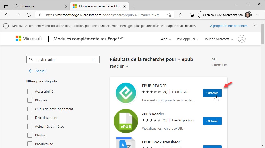Une nouvelle page s’affiche. Tapez epub reader dans la zone de texte de recherche et appuyez sur la touche Entrée du clavier. Cliquez sur le bouton Obtenir en face de l’extension dont le logo correspond à celui de cette copie d’écran :