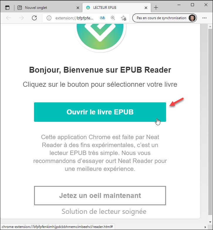 Pour lire un livre au format ePub dans Edge, cliquez sur l’icône EPUB READER, à droite de la barre d’adresse. La page extension://bfpfpfenkimhijpdcbbhmemcimbeehcl/reader.html s’affiche. Cliquez sur le bouton vert Ouvrir le livre EPUB et désignez le livre que vous voulez ouvrir :