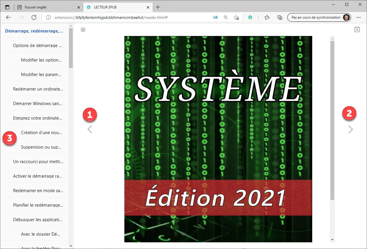 Le livre s’ouvre dans le navigateur. Pour vous déplacer dans les pages qui le composent, utilisez les icônes Page précédente (1), Page suivante (2) et les titres listés dans la table des matières (3) :