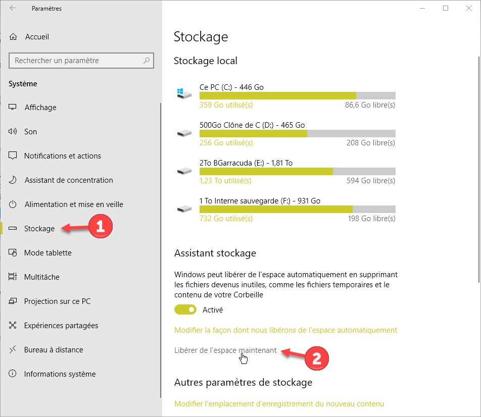 Cliquez sur Démarrer puis sur l’icône Paramètres. La fenêtre Paramètres Windows s’affiche. Cliquez sur Système. Dans la nouvelle fenêtre, basculez sur l’onglet Stockage (1) puis cliquez sur le lien Libérer de l’espace maintenant (2) :
