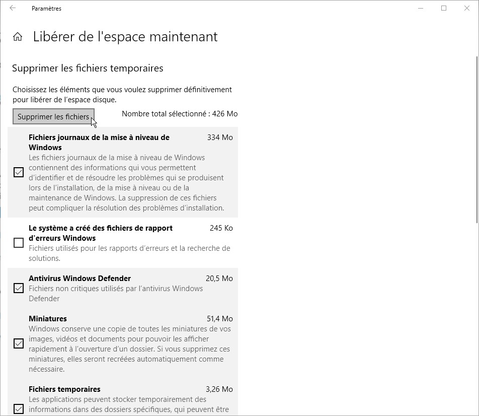 Après une brève analyse, les fichiers qui peuvent être supprimés apparaissent dans la fenêtre :