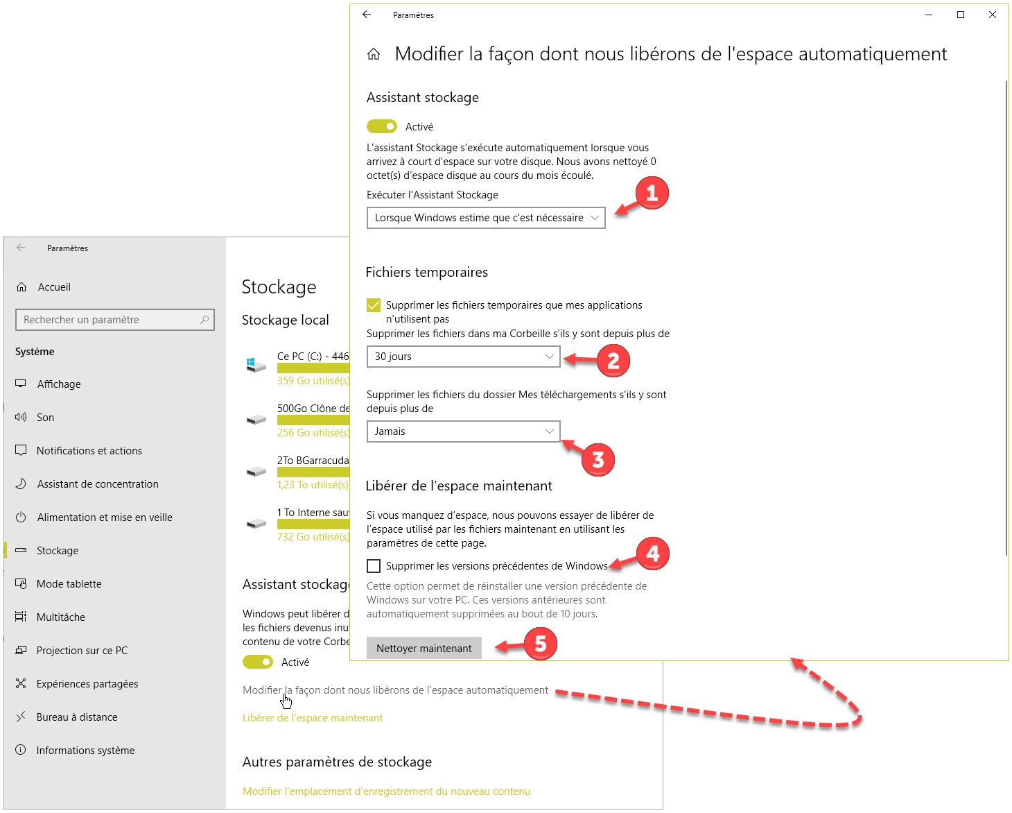 Revenons à la fenêtre précédente. Sous Assistant stockage, cliquez sur le lien Modifier la façon dont nous libérons de l’espace automatiquement :