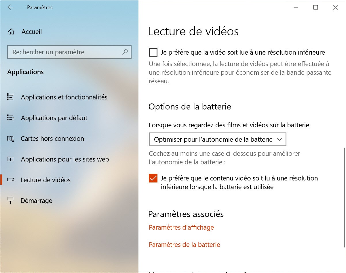 Cliquez sur Démarrer puis sur Paramètres (l’icône en forme de roue dentée). La fenêtre Paramètres Windows s’affiche. Cliquez sur l’icône Applications. La fenêtre Applications et fonctionnalités s’affiche. Sélectionnez l’onglet Lecture de vidéos dans la partie gauche de la fenêtre. Sous Options de la batterie, sélectionnez Optimiser pour l’autonomie dans la liste déroulante et cochez la case Je préfère que le contenu vidéo soit lu à une résolution inférieure lorsque la batterie est utilisée :