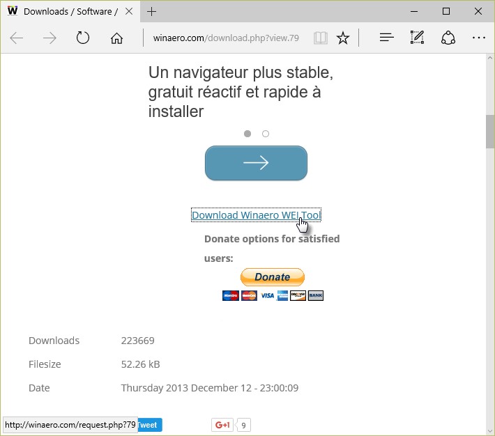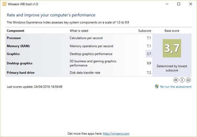 Dans Windows 8 et ses prédécesseurs, un utilitaire bien pratique permettait de connaître les performances des différentes composantes de votre ordinateur. Depuis Windows 8.1 (et donc dans Windows 10), cet outil n’est plus fourni. Heureusement, vous pouvez télécharger son équivalent en vous rendant sur la page http://winaero.com/download.php?view.79. Déplacez-vous un peu plus bas dans la page et cliquez sur le lien Download Winaero WEI Tool :