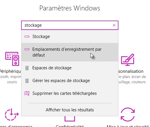 Cliquez sur Démarrer ou appuyez sur la touche Windows et cliquez sur l’icône Paramètres. Si vous aimez les raccourcis clavier, vous pouvez également appuyer sur Windows et I pour parvenir au même résultat. La fenêtre Paramètres Windows s’affiche. Tapez stockage dans la zone de texte et sélectionnez Emplacements d’enregistrement par défaut :