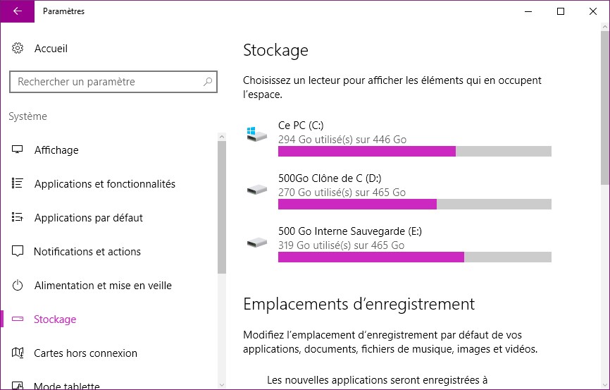 Si votre ordinateur est équipé de plusieurs disques et que le disque système (celui sur lequel Windows est installé) n’a plus beaucoup d’espace disponible, vous pouvez demander à Windows de stocker les nouvelles applications, les nouveaux documents, les nouvelles musiques, etc. sur un autre disque.