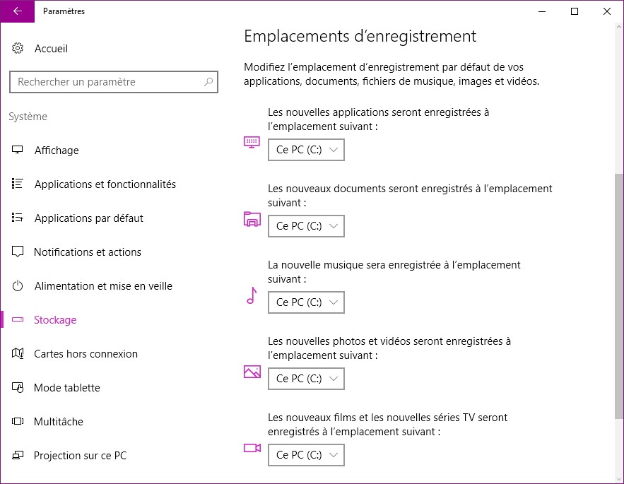 Déplacez la barre de défilement du volet droit pour accéder aux options affichées sous Emplacements d’enregistrement. Vous pouvez alors choisir le disque sur lequel seront enregistrés les nouvelles applications, les nouveaux documents, la nouvelle musique, les nouvelles photos et vidéos ainsi que les nouveaux films et séries TV :