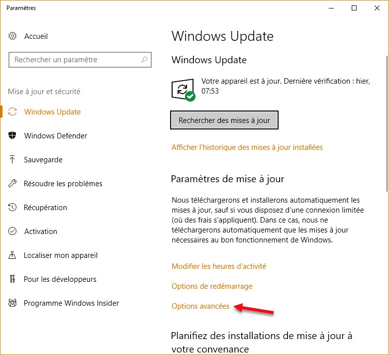 Cliquez sur Démarrer, tapez mises à jour et cliquez sur Rechercher les mises à jour dans la partie supérieure du menu Démarrer. La boîte de dialogue des paramètres s’affiche, onglet Windows Update activé. Cliquez sur Options avancées :