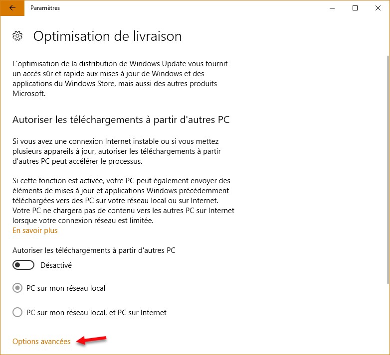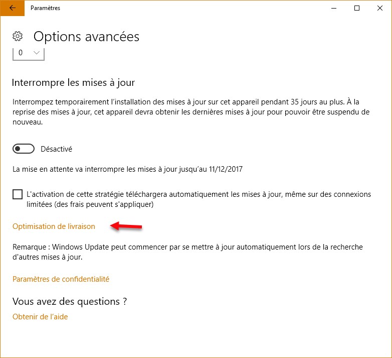 Une nouvelle boîte de dialogue s’affiche. Dans sa partie inférieure, cliquez sur Optimisation de livraison :