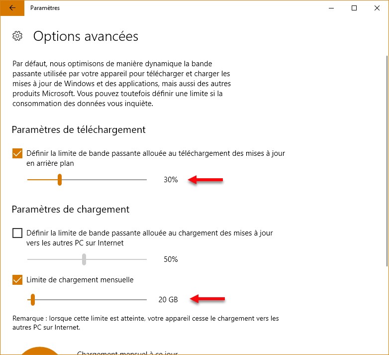 Dans la boîte de dialogue qui s’affiche, vous pouvez limiter la bande passante allouée pour le téléchargement des mises à jour et la limite de téléchargement mensuelle en cochant les cases correspondantes et en agissant sur les curseurs. Ici, par exemple, la bande passante est limitée à 30% et la limite de chargement mensuelle est fixée à 20 Go :