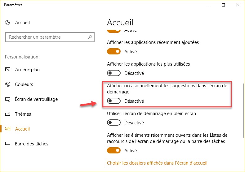 Cliquez du bouton droit sur un emplacement inoccupé de l’écran et sélectionnez Personnaliser dans le menu. La boîte de dialogue Personnaliser s’affiche, onglet Arrière-plan sélectionné. Basculez sur l’onglet Accueil et désactivez l’interrupteur intitulé Afficher occasionnellement les suggestions dans l’écran de démarrage :