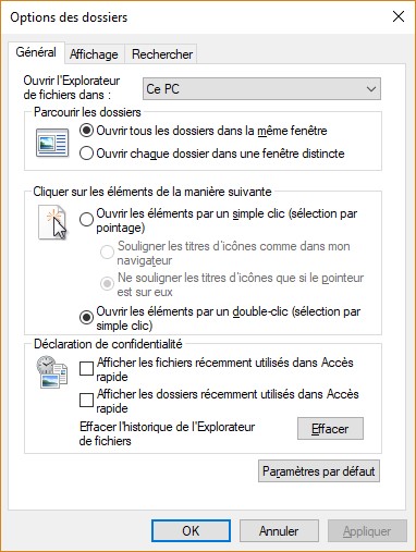 Commencez par ouvrir l’Explorateur de fichiers. Basculez sur l’onglet Affichage, puis cliquez sur l’icône Options. La boîte de dialogue Options des dossiers s’affiche :