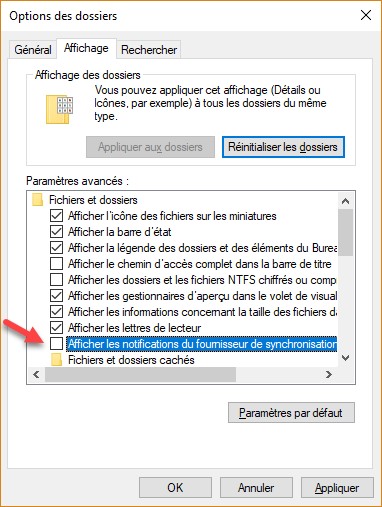 Basculez sur l’onglet Affichage, décochez la case Afficher les notifications du fournisseur de synchronisation et validez en cliquant sur OK :