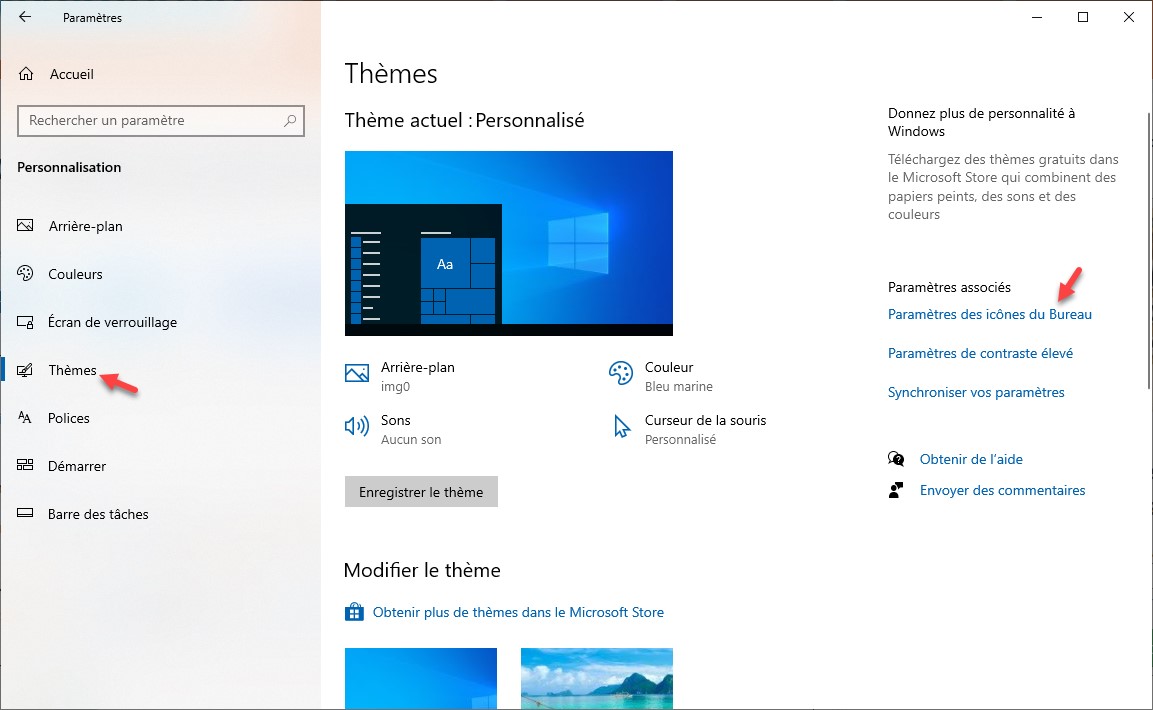 Pour les supprimer, la technique est tout autre. Cliquez sur Démarrer puis sur Paramètres. La fenêtre Paramètres Windows s’affiche. Cliquez sur Personnalisation. Sélectionnez l’onglet Thèmes et cliquez sur Paramètres des icônes du Bureau :