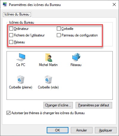 La boîte de dialogue Paramètres des icônes du Bureau s’affiche. Pour faire disparaître les icônes système du bureau, décochez toutes les cases sous Icônes du Bureau, puis cliquez sur OK :