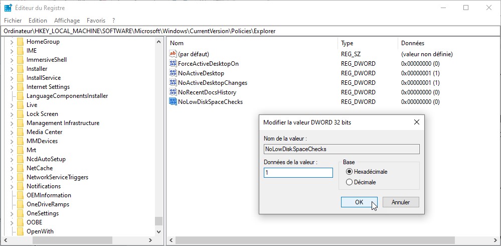 Fermez l’éditeur du Registre et redémarrez l’ordinateur. Le message « Espace disque faible » ne sera plus affiché.