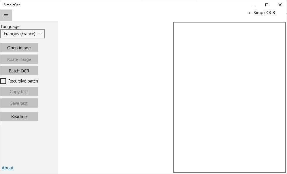 Cliquez sur l’icône SimpleOcr, sur Télécharger, sur Installer, puis sur Lancer. Voici à quoi ressemble la fenêtre de l’application :