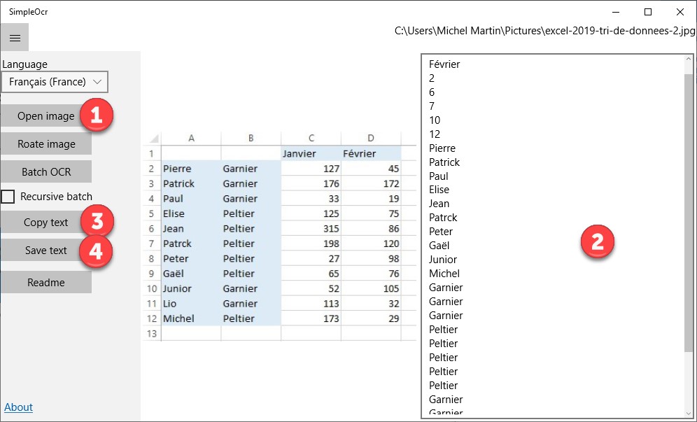Pour extraire le texte d’une image, cliquez sur Open image (1) et désignez l’image. Le texte trouvé dans l’image apparaît dans la partie droite de la fenêtre (2). Vous pouvez le copier dans le presse-papiers en cliquant sur Copy text (3) ou le sauvegarder dans un fichier texte en cliquant sur Save text (4) :