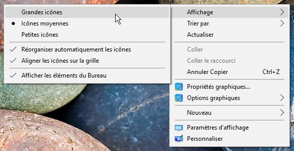 Les icônes du bureau peuvent avoir trois tailles : petite, moyenne ou grande. Pour choisir la taille des icônes du bureau, cliquez avec le bouton droit de la souris sur un emplacement inoccupé du bureau, pointez Affichage dans le menu contextuel et choisissez une des trois tailles proposées :