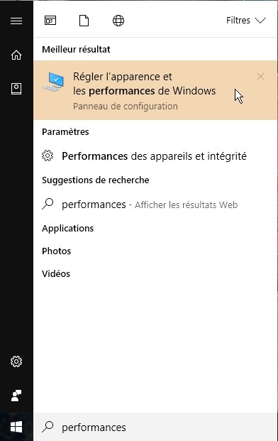 Cliquez sur Démarrer, tapez performances et cliquez sur Régler l’apparence et les performances de Windows dans la partie supérieure du menu Démarrer :