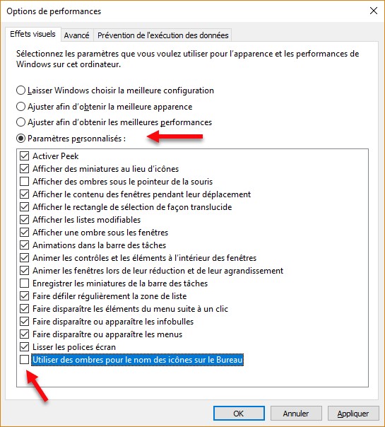 La boîte de dialogue Options de performances s’affiche. Sous l’onglet Options de performances, sélectionnez l’option Paramètres personnalisés. Selon l’effet recherché, cochez ou décochez la case Utiliser des ombres pour le nom des icônes sur le bureau et validez en cliquant sur OK :