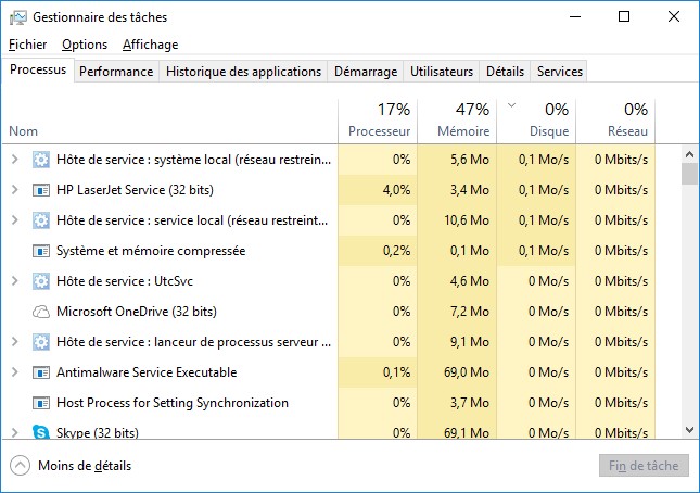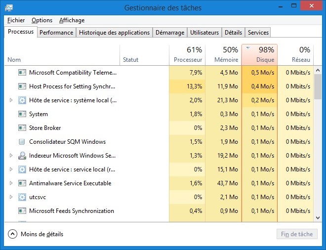 Il arrive parfois qu’un PC devienne subitement très lent. La plupart du temps, ce manque de vigueur est dû à un processus qui accapare le processeur et/ou le disque dur et augmente ainsi le temps de réponse de l’ordinateur. Pour identifier l’application fautive, appuyez simultanément sur les touches Contrôle, Alt et Suppr du clavier et cliquez sur Gestionnaire des tâches. Si une version réduite du gestionnaire des tâches s’affiche, cliquez sur Plus de détails. Sous l’onglet Processus, vérifiez si le processeur ou le disque est occupé à 100%. Si nécessaire, cliquez sur l’en-tête de colonne Processeur ou Disque pour identifier le programme fautif.