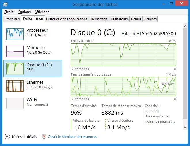 Ici par exemple, le disque dur n’est pratiquement pas utilisé et le processeur est assez peu utilisé :