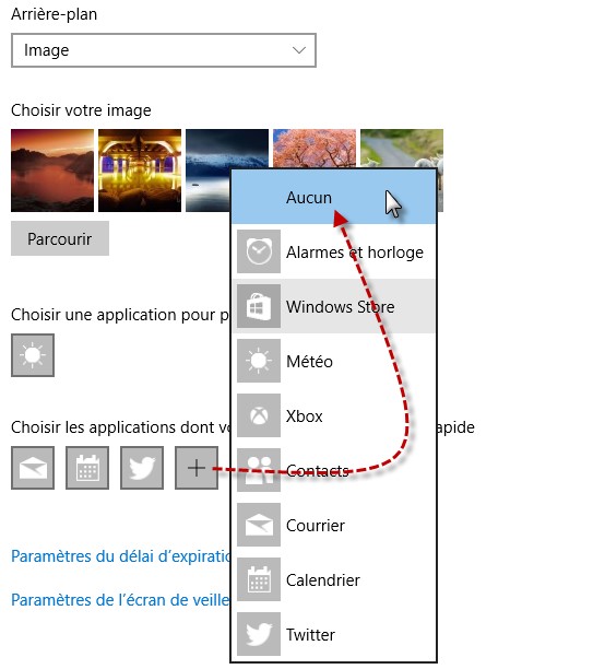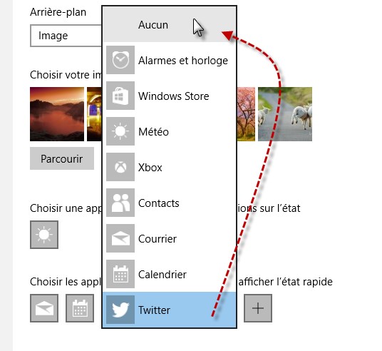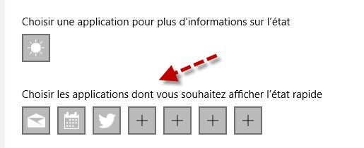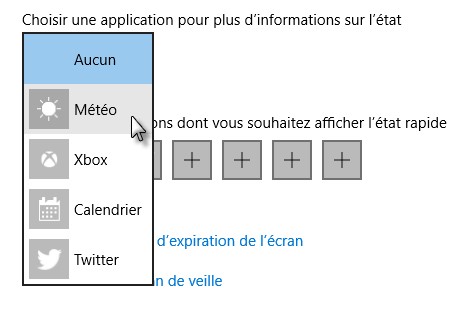 Une seule application peut afficher des notifications détaillées sur l’écran de verrouillage. Pour la sélectionner, cliquez sur l’icône Plus sous Choisir une application pour plus d’informations sur l’état et faites votre choix dans la liste :