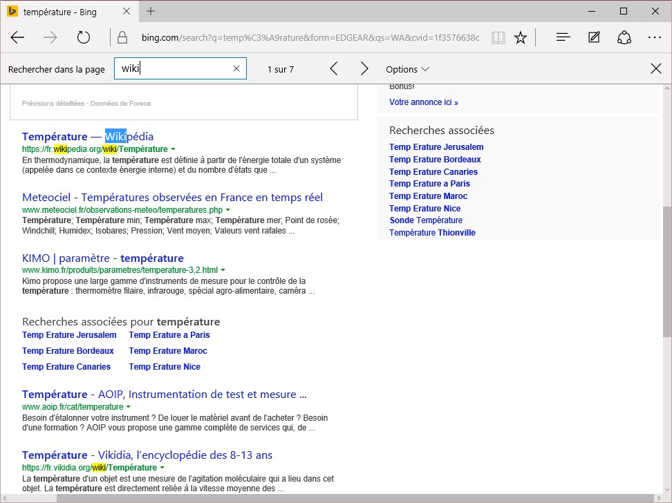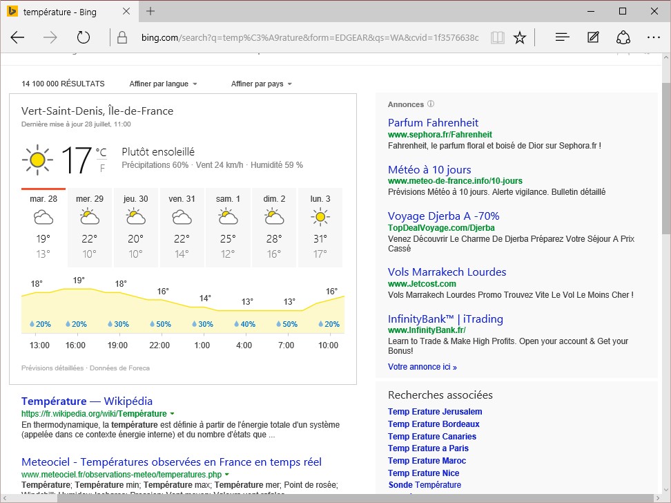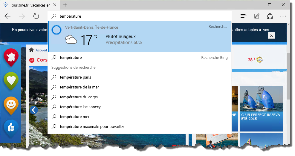 Le Web est tellement vaste que vous pouvez facilement vous y perdre ! Heureusement, la zone de texte de la page de démarrage de Microsoft Edge peut être utilisée pour lancer des recherches dans le moteur de recherche Bing. Indiquez ce que vous recherchez dans la barre d’adresses. Le texte saisi est automatiquement complété. Par exemple, si vous tapez température, la température actuelle du lieu où vous vous trouvez est affichée et plusieurs termes de recherche complémentaires vous sont proposés :