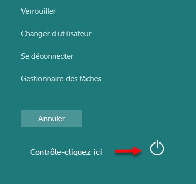 Appuyez simultanément sur les touches Contrôle, Alt et Suppr du clavier. Repérez l’icône Arrêter, dans l’angle inférieur droit de l’écran. Maintenez la touche Contrôle du clavier enfoncée et cliquez sur l’icône Arrêter :