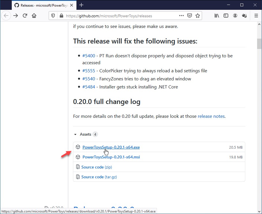 Rendez-vous sur la page https://github.com/microsoft/PowerToys/releases et téléchargez la dernière version de Microsoft PowerToys (0.20.1 alors que j’écris ces lignes) :