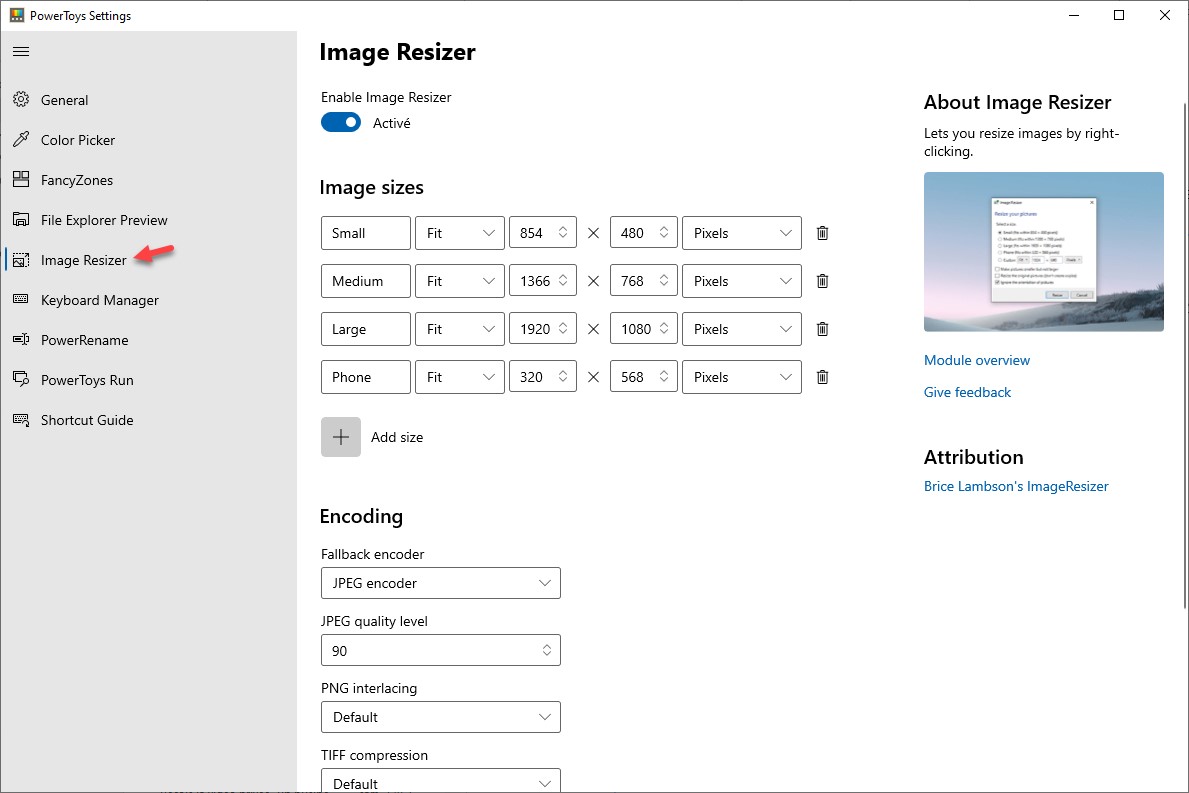 Une fois l’installation terminée, appuyez puis relâchez la touche Windows du clavier, tapez powertoys, puis cliquez sur PowerToys (Preview) dans la partie supérieure du menu Démarrer. La fenêtre PowerToys Settings s’affiche. Basculez sur l’onglet Image Resizer :