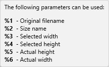 Et enfin, sous File, vous pouvez définir le modèle du nom des images redimensionnées. Par défaut, le modèle retenu est %1 (%2), ce qui correspond au nom original suivi du nom de la taille entre parenthèses, mais rien ne vous empêche de choisir un autre modèle. Pointez la zone de texte Filename format pour avoir un aperçu des paramètres supportés et composez votre modèle :