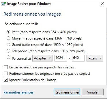 4. Cette action affiche la boîte de dialogue Image Resizer for Windows. Choisissez une des tailles proposées ou définissez une taille personnalisée en sélectionnant l’option Personnalisé, puis cliquez sur Redimensionner. Les images sont immédiatement redimensionnées :