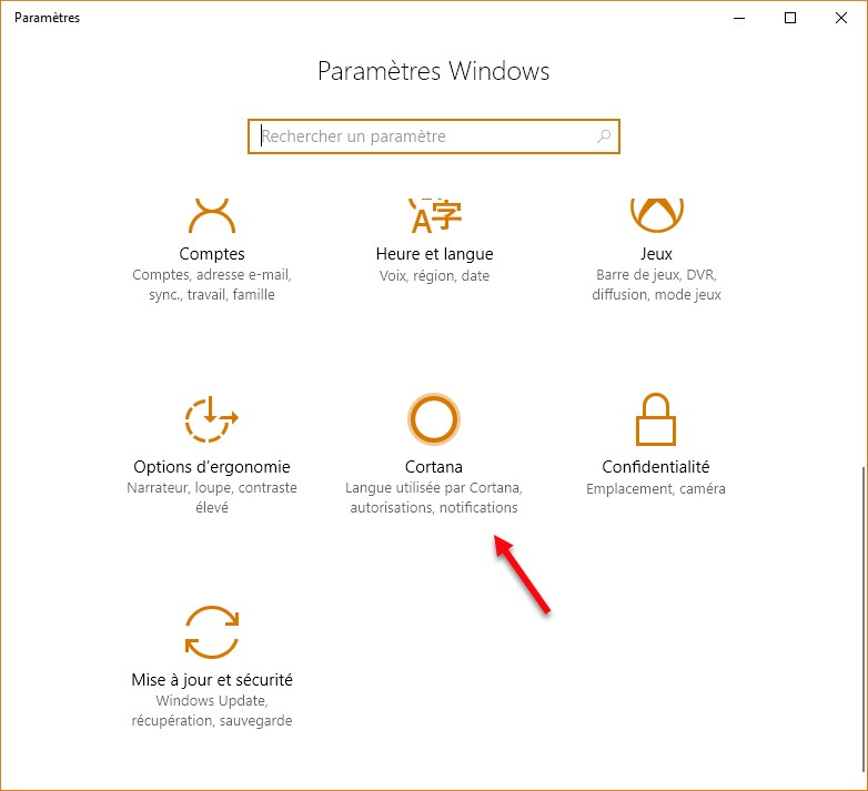 Dans Windows 10 Fall Creators Update, tous les réglages concernant Cortana sont regroupés dans une catégorie de la boîte de dialogue Paramètres Windows. Cliquez sur Démarrer puis sur Paramètres. Tous les paramètres concernant Cortana sont accessibles en cliquant sur l’icône Cortana :