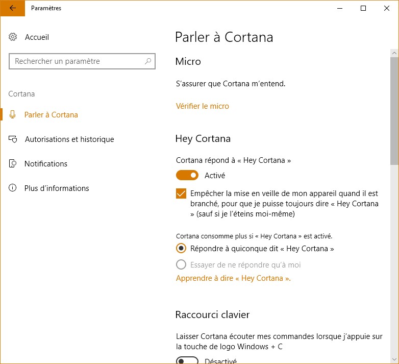 - Activer ou désactiver la fonctionnalité Hey Cortana.