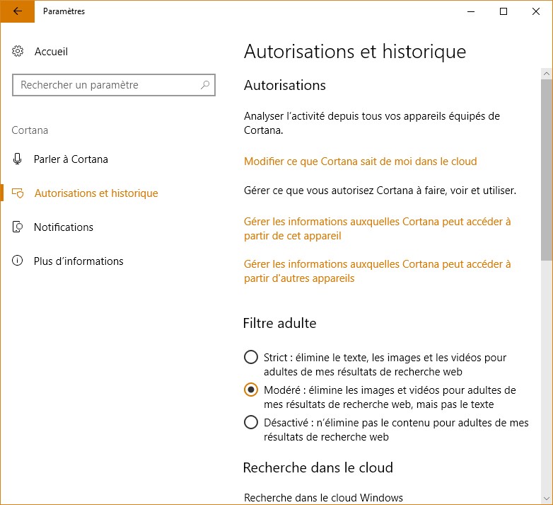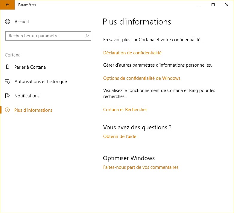 Basculez sur l’onglet Plus d’informations. Ici, vous avez accès à des informations complémentaires sur le fonctionnement de Cortana :