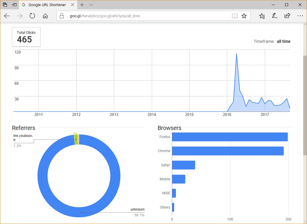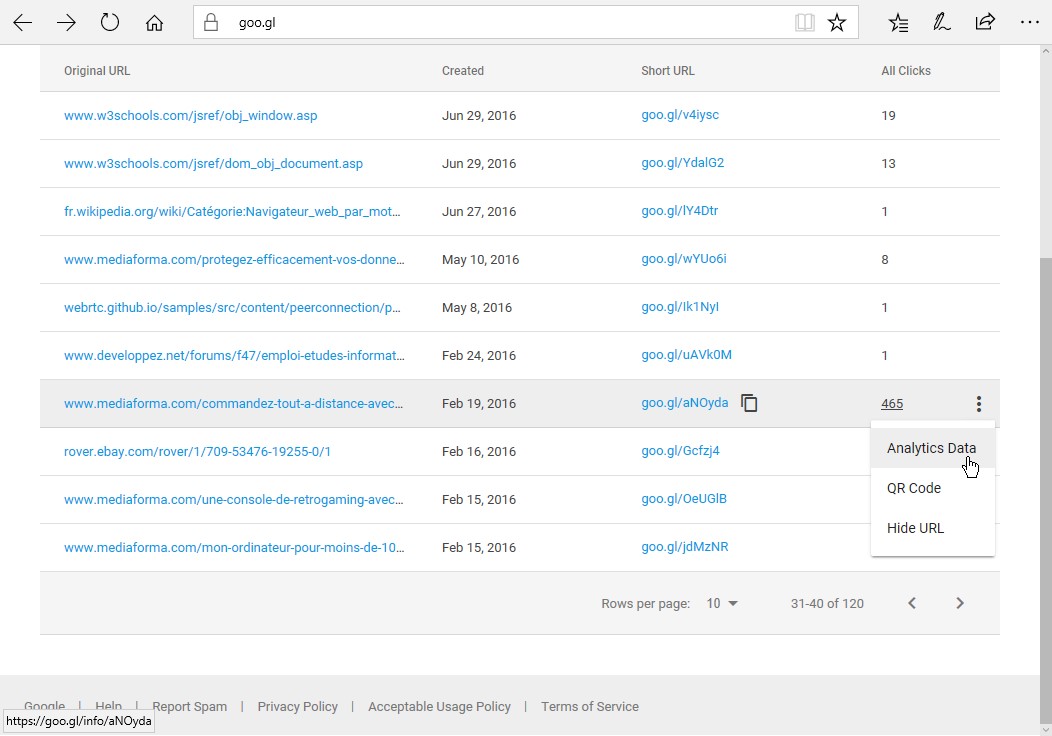- Le suivi du nombre de clics : les rétrécisseurs d’URL fournissent des informations sur le nombre de clics. Par exemple sur goo.gl, cliquez sur les points de suspension en face du lien à analyser et choisissez Analytics Data dans le menu :
